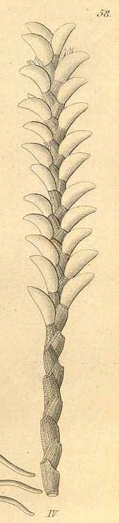 Found in Chachapoyae Peru without elevational data as a miniature to just small sized epiphyte with an apparently simple, stout, strict densely leafy stem enveloped by leaf sheaths that are longitudinally and transversly rugose and shiny carrying conduplicate, recurved, numerous, spreading, oblong-semilunate, acute, anterior margins minutely denticulate leaves that blooms on very short, racemose, much shorter than the leaves, few flowered inflorescence with triangular, as long as the ovary floral bracts and carrying very small flowers with sub-parellel segments.