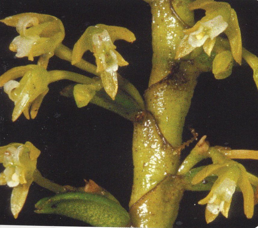 Found in Colombia and Peru in elfin forests at elevations around 2200 meters as a miniature sized, cold growing epiphyte with an erect, simple stem enveloped entirely by imbricating leaf sheaths carrying alternate, distichous, strongly conduplicate-compressed, elliptic when flattened, anteriorly denticulate margined leaves that blooms in the spring on a many axillary, short, peduncle to .2" [.5 cm] long, 1 to 2 flowered inflorescence with small, ovate floral bracts and carrying white, campanulate flowers.