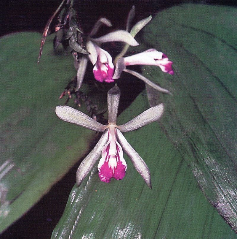 Found in Panama and Colombia at elevations of 10 to 550 meters as a small sized, hot growing terrestrial with 1 to 3 stems carrying 3 to 6, sub-distichous, or spiral, plicate, shiny, elliptic, acuminate leaves that blooms in the winter, spring and summer on a terminal, erect, peduncle slender, flattened, commonly arching, 1.2 to 3.2" [3 to 8 cm] long, rarely branching, successively single, to 20 flowered inflorescence that may last 2 to 3 seasons with deltoid, acuminate, fleshy, sub-distichous floral bracts