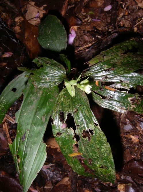 Found in Heredia province of Costa Rica in in old second growth tropical wet forests at elevations around 100 meters as a small sized, hot growing terrestrial with several, plicate, elliptic, shortly acuminate, petiolate base leaves that blooms in the later spring on a terminal, peduncle to 1" [2.5 cm] long, rachis .8 to 1" [2 to 2.5 cm] long, successively single, few flowered inflorescence with several elliptic-ovate, shortly acuminate, heavily 8 to 9 nerved with prominent cross veinsbracts and carrying sordid flowers with purple veins inside.