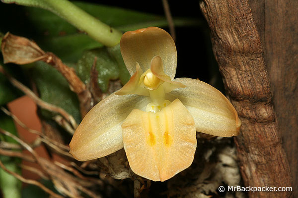 Found in Thailand and Myanmar with rugose elliptic pseudobulbs carrying 1 to 2, 5 veined, ovoid, acute leaves that blooms in the winter and spring on a short, single flowered inflorescence