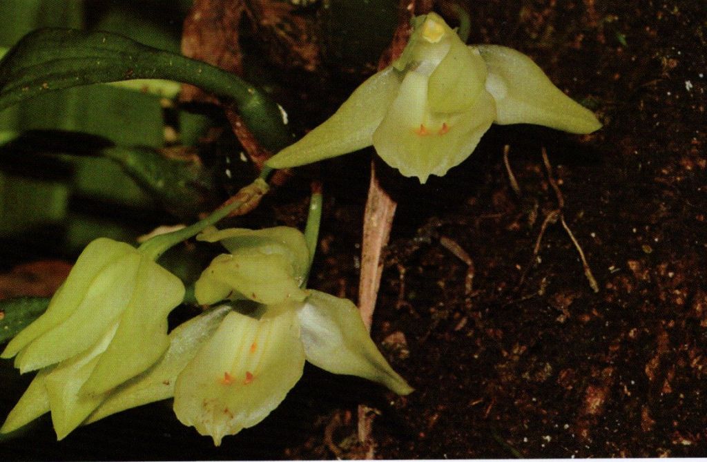 Found in Assam, eastern Himalayas, Nepal, Bhutan, Chinese Himalayas, Laos, Thailand, Malaysia and Vietnam on rocks in open oak forests at elevations of 1500 to 2200 meters as a miniature sized, cool to cold growing litho-epiphyte with caespitose, ellipsoid-obovoid pseudobulbs carrying 2, elliptic-lanceolate, lanceolate or linear, plicate, 3 veined, petiolate base leaves that blooms in the spring through fall on a short, single flowered inflorescence enveloped by imbricate sheaths and has scarious, brown floral bracts all arising on a newly emerging growth.