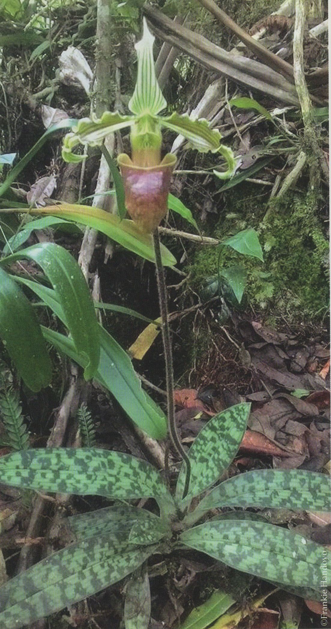 Found in the Aceh region of northern Sumatra at elevations around 1575 meters as a small sized, cool growing terrestrial with 6 or so, light green mottled darker green, elliptic to lanceolate leaves that blooms on an erect, 48" [120 cm] long, single flowered inflorescence.