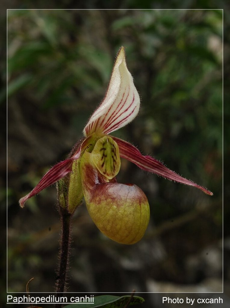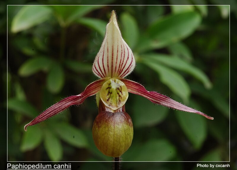 References W3 Tropicos, Kew Monocot list , IPNI ; *Turczaninowia 13(2): 92 Averyanov & Gruss 2010 drawing/photo fide; AOS Bulletin Vol 79 #5 2010 photo fide; AOS Bulletin Vol 80 #2 2011 photo fide; Orchid Digest Vol 75 #2 2011 photo fide; Orchid Digest Vol 76 #1 2012 photo fide; Orchid Digest Vol 76 #4 2012 photo fide; Turczaninowia 16(4):26-46 NEW AND RARE ORCHIDS (ORCHIDACEAE) IN THE FLORA OF CAMBODIA AND LAOS Averyanov 2013 photo fide; Orchid Digest Vol 78 #2 2014 photo fide; Orchid Digest, April, May, June 2014 - Paphiopedilum Canhii In Laos Phou Phachao Mountain – Mountain Of Paphiopedilum Canhii Leonid V. Averyanov , Khang Nguyen Sinh, Tien Hiep Nguyen, The Van Pham, Shengvilai Lo PHOTOS FIDE; Orchid Digest Vol 78 #4 2014 photo fide;