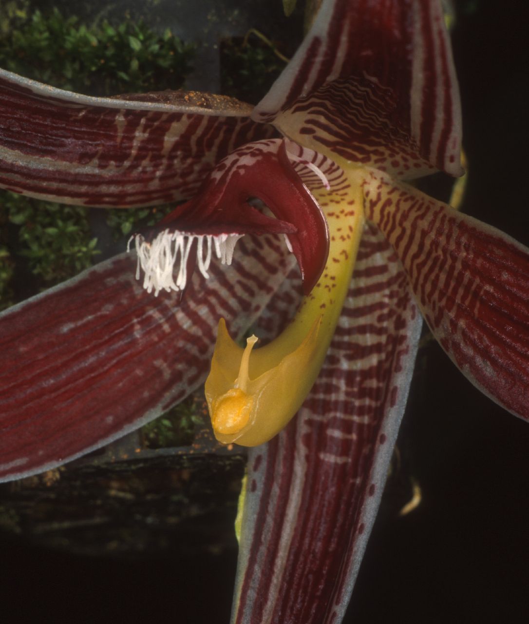Found in Colombia, Peru, Venezuela, Trinidad, Guyana, Surinam, and French Guiana in wet forests as a medium sized, warm to hot growing epiphyte occuring at lower elevations around 200 to 1000 meters with tufted, elongate-ovoid, sulcate, slightly compressed pseudobulbs carrying 2 apical, membraneous, soft, broadly lanceolate to elliptic-lanceolate, acute, plicate leaves and blooms in the autumn to early winter and late spring on a basal, pendant, 4 to 8 " [10 to 20 cm] long, bracteate, 2 to 3 flowered inflorescence arising as a new growth appears and carrying large, showy flowers.