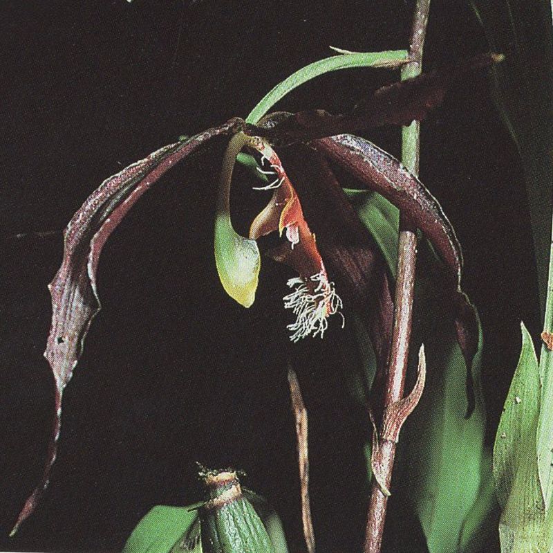Found in Amazonas, Atabapo-Sipapo Venezuela in humid lowland shrublands at elevations of sealevel to 200 meters as a small sized, hot growing terrestrial beneath shrubs with a short rhizome giving rise to adpressed, laterally compressed, narrowly ovate, ribbed, pseudobulbs with 2 to 3, surrounding the base, distichous, deciduous, foliaceous sheaths and carrying 2, apical, heavily veined beneath, narrowly ovate, acuminate leaves that blooms in the later spring on an erect, basal, stout, enveloped by 2 to 4 sheaths, 8.8" [22 cm] long, 3 to 5 flowerewd inflorescence carrying nodding, resuppinate flowers.