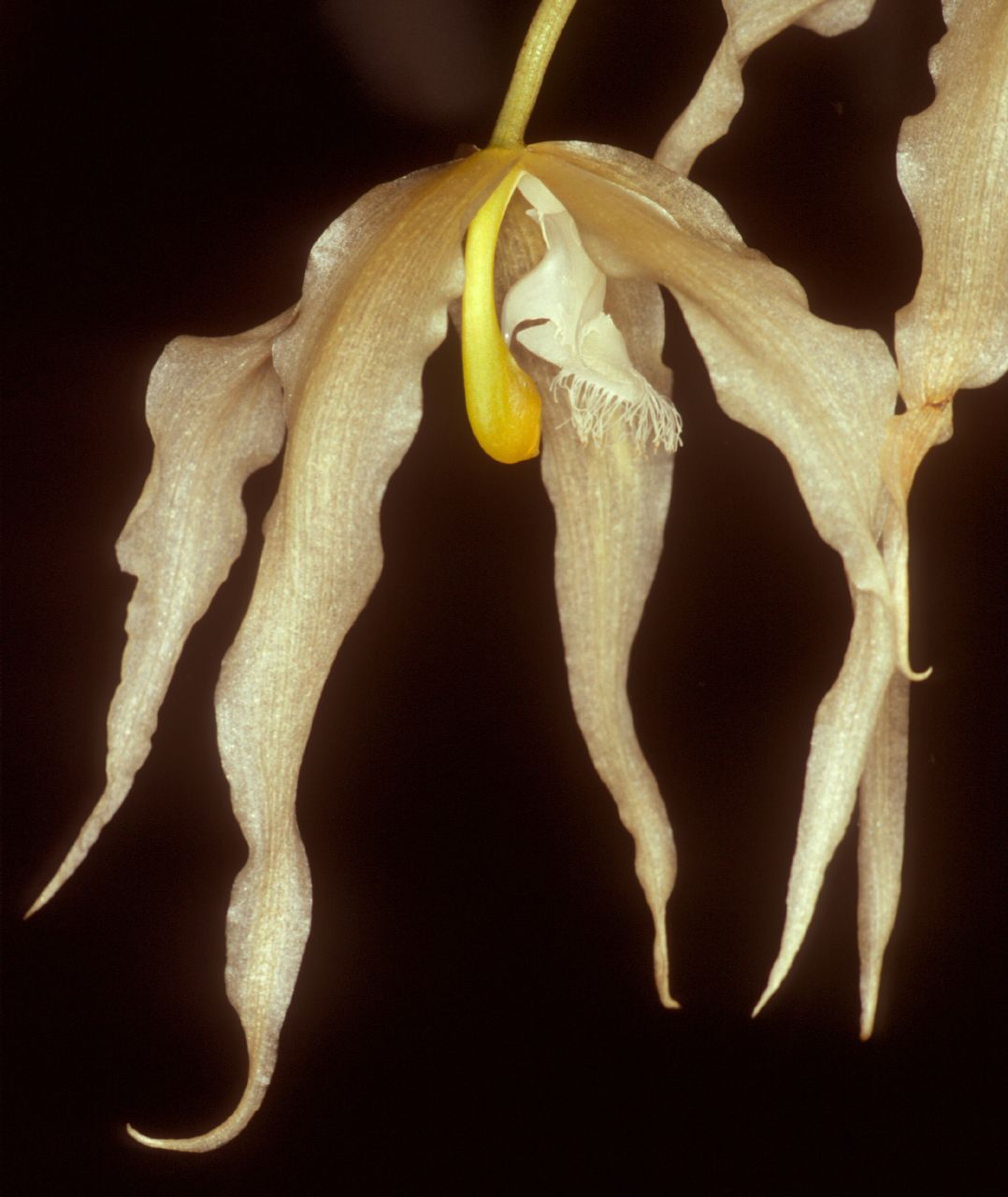 Found in northern most Ecuador in montane forests at elevations of 200 to 1500 meters as a small sized, hot to cool growing epiphyte with aproximate, ovate, compressed, pendent, light green pseudobulbs enveloped basally by several imbricate non-foliaceous sheaths and carrying 3 apical, erect, plicate, thin, obovate, obtuse, apiculate leaves that blooms in the fall on a basal, 2" [5 cm] long, racemose, pendant, glabrous, 2 to 3 flowered inflorescence enveloped by 3 to 5 tubular, slightly inflated sheaths and tubular floral bracts enveloping the base of the ovary.