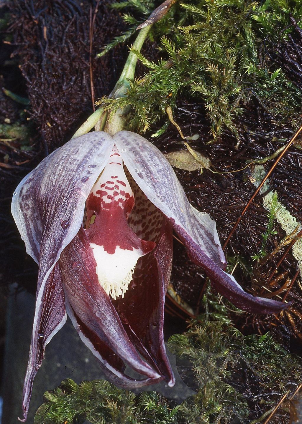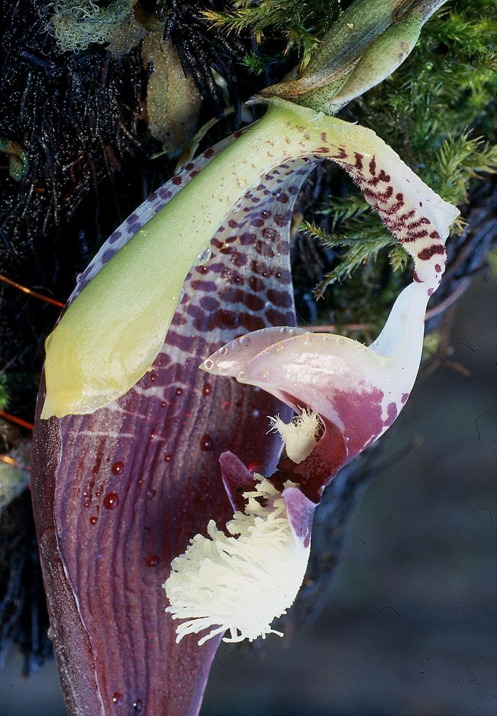 Found in northern Brazil on trees as a medium sized, hot to warm growing epiphyte with clustered, robust, ovoid to globular-ovoid, laterally compressed to compressed on two sides pseudobulbs enveloped by 2 small basal sheaths and carrying 2, apical, erect, lanceolate, acuminate, gradually narrowing below into the conduplicate, pseudo-petiolate base leaves that blooms in the spring on a pendant, thin, 1.2 to 3.2" [3 to 8 cm] long, 1 to 3 flowered inflorescence enveloped by 3 to 4, acuminate, lanceolate bracts.