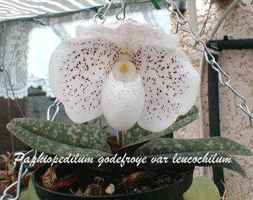 Synonyms Cypripedilum godefroyae var lecochilum Rolfe 1894; Paphiopedilum godefroyae f. leucochilum (Rolfe) Braem & Chiron 2003; Paphiopedilum godefroyae var. ang-thong (Fowlie) Braem 1988; Pahiopedilum godefroyae var leucochilum [Masters] Hallier 1897;
