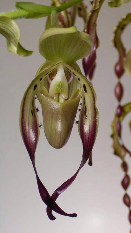 Common Name Parish's Paphiopedilum [English Orchid Collector 1800's] - in Thailand Rangthao nari mu'ang kan, Rangthao nari nuat ruesi - In China Piao Dai Dou Lan