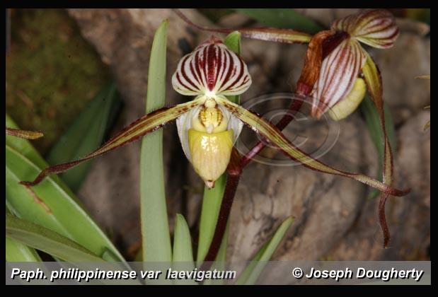 Synonyms Cordula philippinensis [Rchb.f] Rolfe 1912; Cypripedium cannartianum hort. ?; Cypripedium laevigatum Bateman 1865; *Cypripedium philippinense Rchb.f 1862; Paphiopedilum laevigatum [Bateman]Pfitz 1888; Paphiopedilum philippinense f. alboflavum O.Gruss 2000; Paphiopedilum philippinense f. album Valmayor & D.Tiu 1984 ; Paphiopedilum philippinense var. compactum O.Gruss, Roellke & Roeth 2008; Paphiopedilum roebelenii f. alboflavum (O.Gruss) Braem & Chiron 2003; Selenipedium laevigatum May 1885