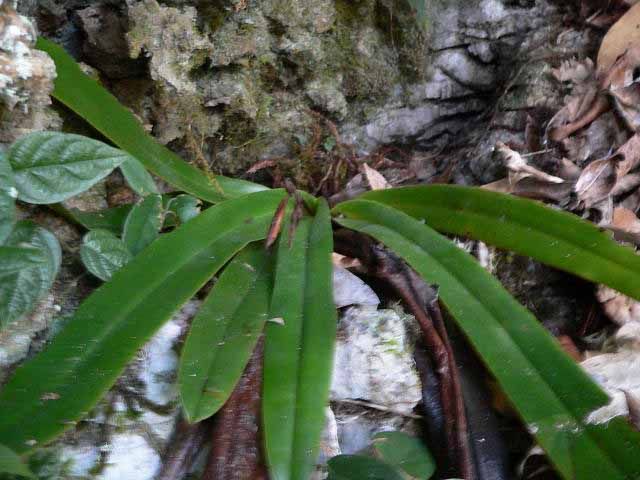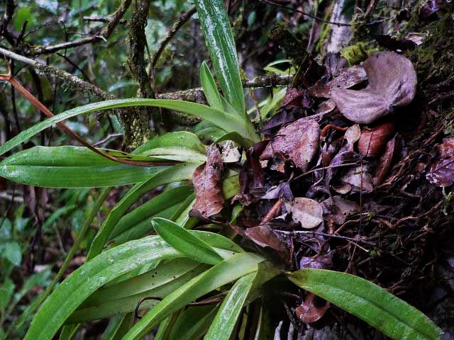 A medium sized, hot to warm growing, lithophytic species found on southeastern facing, seeping, vertical limestone cliffs in Borneo at elevations of 150 to 900 meters that has 4 to 5, linear, shiny green leaves and has multiflowered blooms in the spring through winter on a suberect, terminal, purple, 2' [60 cm] long, pubescent inflorescence with an elliptic-lanceolate, red brown, floral bract carrying 2 to 5, simultaneously opening flowers.
