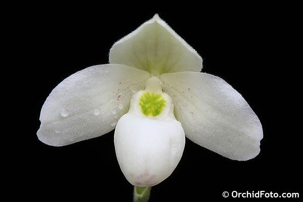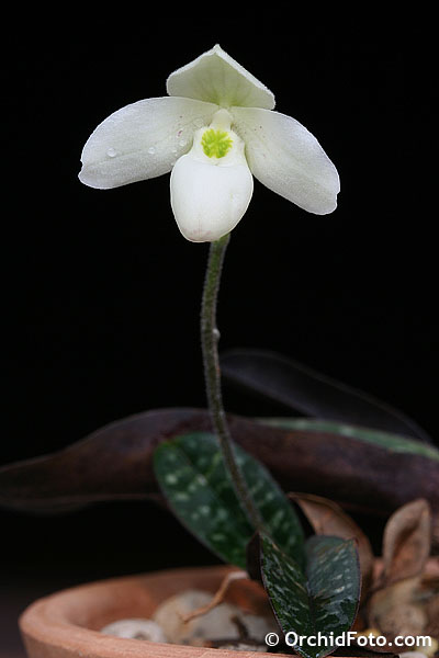 Found in Thailand in the shade of primary forests on steep cliffs and slopes of highly eroded limestone at elevations of 350 to 450 meters as a miniature sized, hot growing lithophyte with 3 to 5, narrowly elliptic to oblong, rounded and minutely tridenticulate apically, mottled very dark and pale green above, heavily mottled purple beneath, ciliate at the base leaves that blooms in the spring on an erect, shortly but densely white pubescent, erect, 2.4 to 6.8" [6 to 17 cm] long, single flowered inflorescence with conduplicate, broadly ovate, obtuse, pale green, spotted purple floral bracts.
