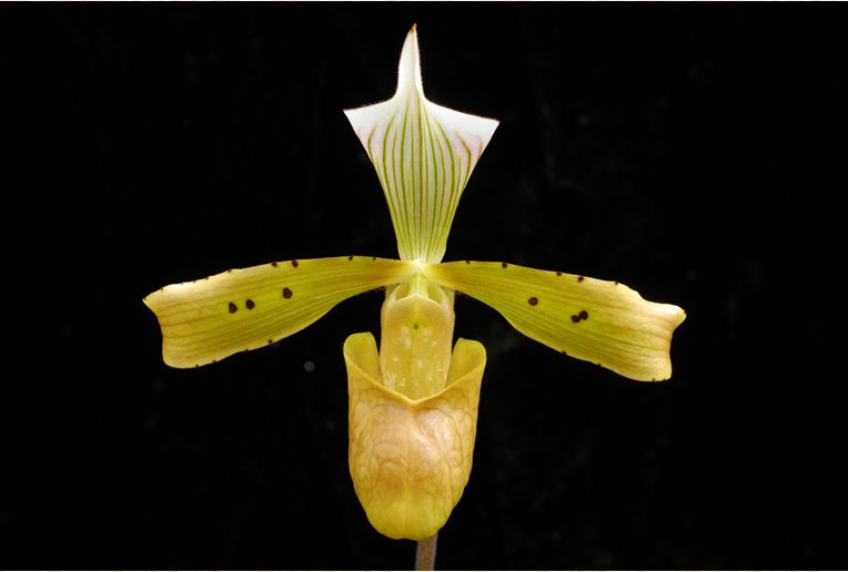 Common Name The Bald Paphiopedilum [Refers to the flowers having no hairs]