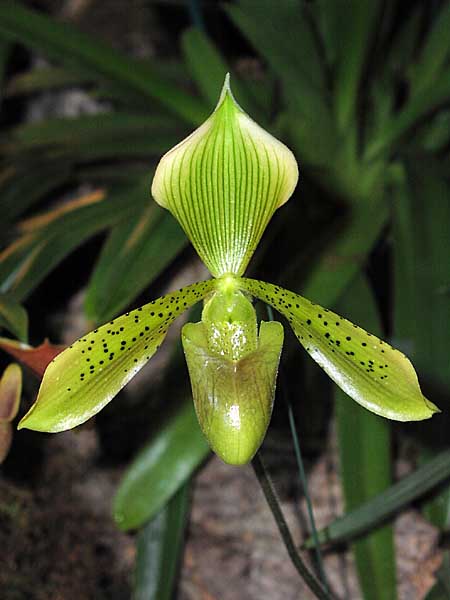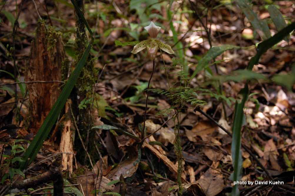 Found in Borneo and Sumatra in shady pockets of leaf litter over limestone at elevations of 1000 to 1800 meters as a small sized to medium sized, cool growing herbaceous-humus epiphyte with oblong-elliptic, deep green mottled with gray green leaves with purple undersides that blooms in the fall and winter on an erect, terminal, 12 to 15" [30 to 37.5 cm] long, purple marked, single flowered inflorescence with an elliptic-lanceolate floral bract.