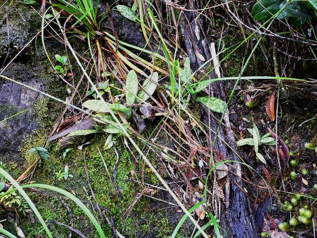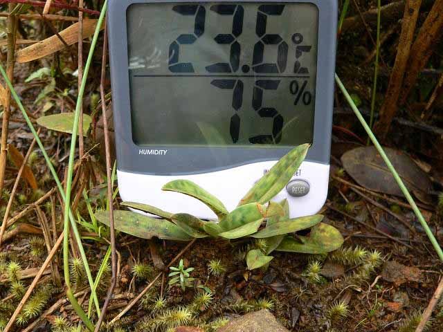 Found only within Sabah in northern Borneo in hill and montane forests on screes in the shade of bushes or in leaf litter along ridge tops at elevations of 600 to 2600 meters as a miniature sized, warm to cold growing lithoterrestrial found on serpentine rocks, cliff faces along waterways, in moss or humus filled cracks, in deep leaf litter or on rocks and tree roots in light shade near waterfalls, with a few, oblong-elliptic, obtuse, minutely tridentate, boldly tessellated dark and light green above, purple spotted leaves beneath that blooms in the spring and summer on an erect, to 20" [to 50 cm] long, purple, white pubescent, single flowered inflorescence with a lanceolate, acute, pubescent, pale brown floral bract.