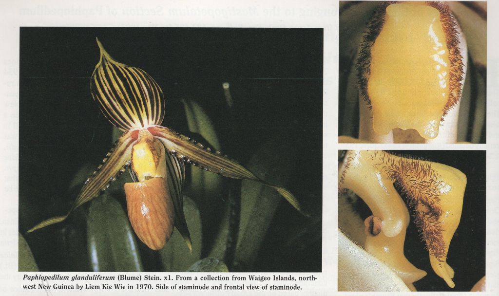 Often cited as a synonym of P praestans but there are diferences in the shape and color of the staminode and so I have kept them separate. glanduliferum had a chrome yellow staminode that is much longer than wide with a distal notch from which protrudes a central tooth, while P willhelminae has an almost perfectly square, deep blood red staminode that is indented on the side and distally terminates with a distal minute apiculus.