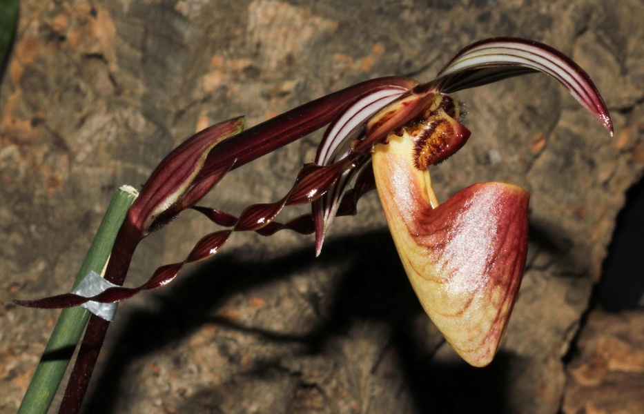 Found in central New Guinea along rivers at elevations around 1700 meters as a medium sized, cool growing terrestrial that blooms on a 4 to 4.8” [10 to 12 cm] long, bracted, single flowered inflorescence