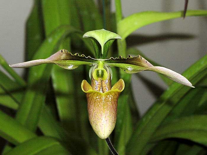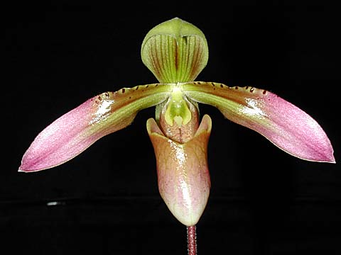 Found in Cambodia as another orchid species allied to P. appletonianum, light green 5" leaves vaguely veined and tessellated, tall upright single flowered 12" spikes producing a 2 1/2" bloom occuring in the winter and spring