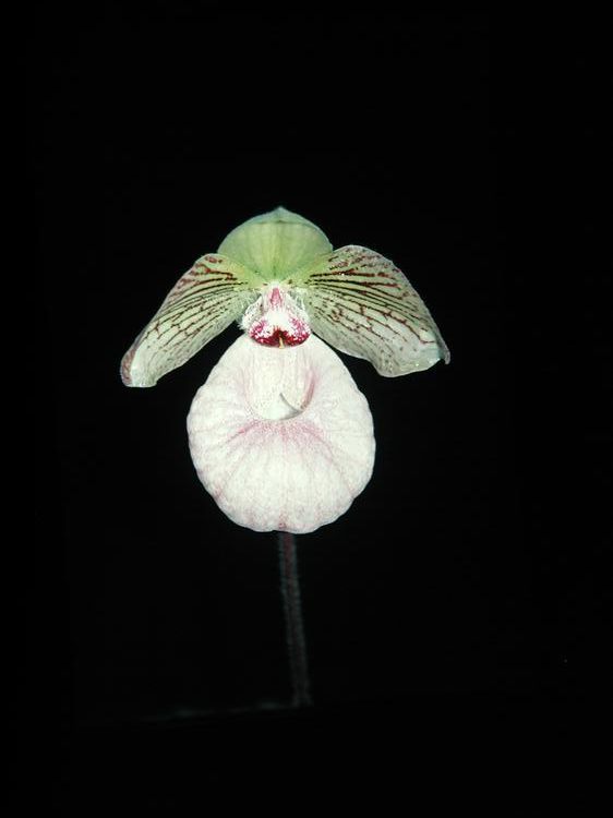 Found in southern China as a warm to cool growing natural hybrid between P malipoense and P micranthum in coniferous, mixed, broad-leaved, evergreen closed forests on limestone at elevations of 800 to 1400 meters that blooms in the spring on an erect, single flowered inflorescence.