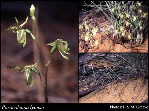 Paracaleana lyonsii Hopper & A.P.Br. 2006Photography by I & M Greeve . Image used with the permission of the Western Australian Herbarium, Department of Environment and Conservation (http://florabase.dec.wa.gov.au/help/copyright). Accessed on Wednesday, 29 August 2012 © and The Florabase Website