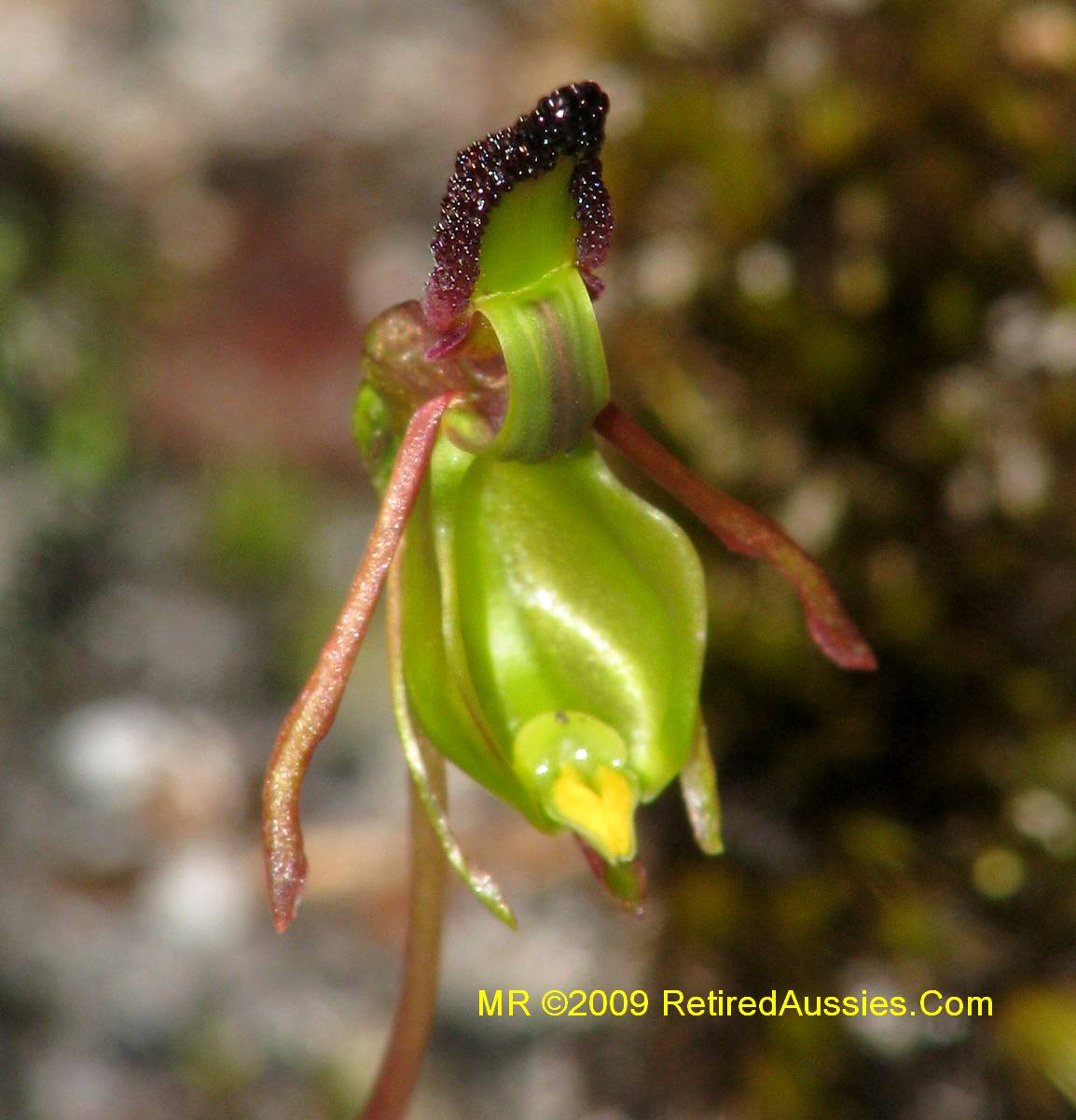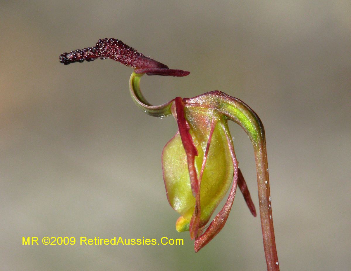 Found in Western Australia in coastal open forests in heath and coastal scrub often near winter-wet flats and swamps at elevations of 0 to 300 meters as a mini-miniature to miniature sized, cold growing terrestrial with a single, dull green above, purplish beneath, terete leaf that blooms in the late winter and earlier spring on an erect, 2 to 6" [5 to 15 cm] long, 1 to 2 flowered inflorescence