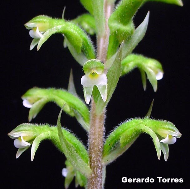 Found in Colombia and Venezuela as a small sized, terrestrial orchid with an erect stem enveloped partially by narrowly lanceolate, acute sheaths and carrying lanceolate, acute, gradually narrowing below into the elongate, channeled, petiolate base leaf that blooms on an erect, terminal, 4" [10 cm] long, several flowered inflorescence with linear, acute, longer than the ovary floral bracts.