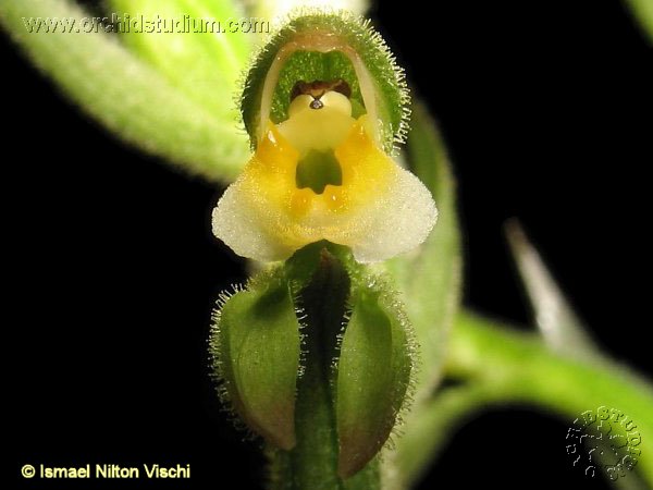 Found in eastern and southern Brazil and northern Argentina as a small sized, cool to cold growing terrestrial with an erect stem enveloped partially by lanceolate, acute, pubescent sheaths and carrying 2?, broadly elliptic, dark green white blotched, acute, gradually narrowing below into the elongate, channeled, petiolate base leaves that blooms on an erect, 8" [to 20 cm] long, several flowered inflorescence with a few distant , triangular, acuminate bracts and longer than the flower, pubescent, linear, acute, floral bracts