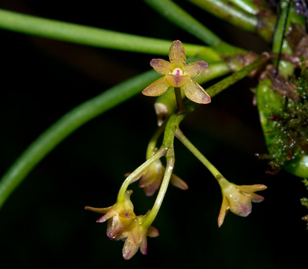 Found in Nagaland India and Yunnan China and expected in northern Burma on tree trunks or branches in broad-leaved forests at elevations of 1600 to 2000 meters as a mini-miniature to just small sized, cool growing epiphyte with erect to ascending stems carrying fleshy leaves that blooms in the later winter and early spring on 1 to 2, arching to pendulous,[3 to 4.5 cm] long, rachis clavate, 2 to 10 flowered inflorescence with ovate, membraneous, shorter than the ovary floral bracts.