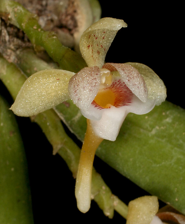 Found in penninsular Malaysia in lowland primary forests at elevations of 50 to 100 meters as a mini-miniature sized, hot growing epiphyte with an unbranched, short, compressed stem enveloped completely by leafbearing sheaths and carrying 4 to 7, distichous, held in a horizontal fan, decurved apically, oblong to slightly obovate, leathery, green, rounded and unequally bilobed apically, tapering below into the very short, canaliculate, petiolate basally clasping leaves that blooms in the summer on several, lateral, horizontal to descending, glabrous, stoutly cylindrical and fleshy becoming 2 winged towards the apex, gradually extending to .8" [2 cm] long, fractiflex, 2 rowed, successively single, 6 to 12 flowered inflorescence with persistent, ovate, brown, erose to denticulate margin, minutely apiculate apically floral bracts and carrying short lived flowers