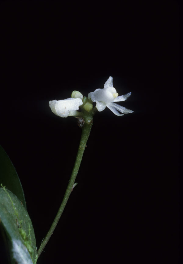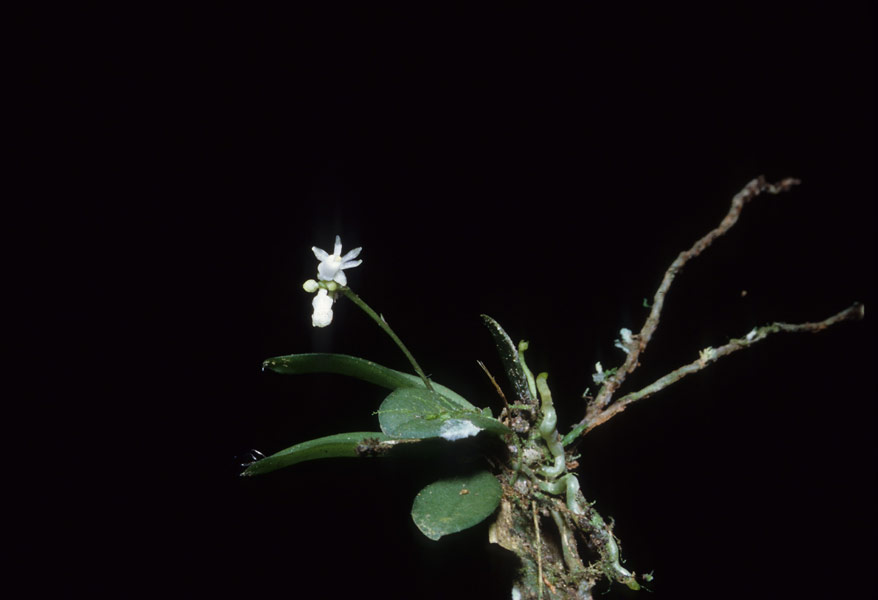 Found in Sarawak Borneo in lowlands as a mini-miniature sized, cool growing epiphyte with a short monopodial stem enveloped by leaf bases carrying oblong, unequally bilobed apically, acute to obtuse, undulate margin, 2 ranked leaves that blooms on 1 to 2, patent, axillary, to .4" [1 cm] long, many, crowded recurved bracts, successivey 1 to 2, few flowered inflorescence.