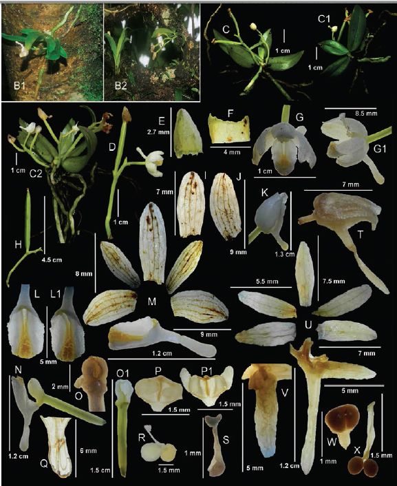 KEY TO PHOTO B–B2. Pennilabium labanyaeanum in the wild. C–C2. Habit. D. Inflorescence. E. Floral bract. F. Peduncle sheath. G & G1. Flower, front & side views. H. Fruit. I. Dorsal sepal, dorsal view. J. Lateral sepal, dorsal view. K. Flower bud, side view. L. Lip, front view. L1. Lip, front view (highlighting the narrow hollow channel with minute hairs at the base). M. Floral perigon with spurred lip. N. Spurred lip(side view) with column, pedicel and ovary. O. Column, close view. O1. Column with pedicel & ovary. P & P1. Anther, front views. Q. Longitudinal section of spur. R. Pollinia with stipe. S. Stipe. Pennilabium naja P.O’Byrne (images taken from the spirit sample of the holotype O’Byrne SUL107 at SING) T. Flower, side view. U. Floral perigon with spurred lip. V. Lip, front view. W. Anther, front view. X. Pollinia with stipe. (Photos: C. Deori & N. Odyuo)