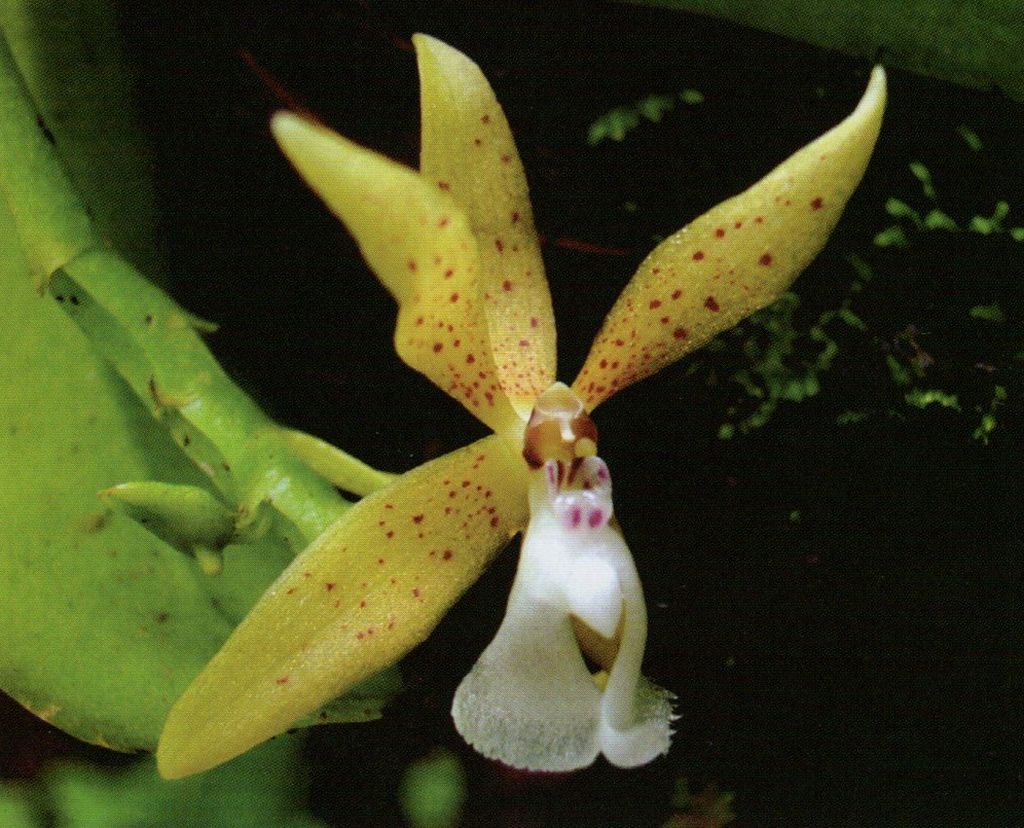Found in south Yunnan province of China and Taiwan on tea trees at elevations around 1300 meters as a miniature sized, cool growing epiphyte with an erect stem carrying 3 to 4, oblong, acute and unequally bilobed, slightly twisted base leaves that blooms in the late summer and early fall on a basal, more or less pendulous, to 1.6" [4 cm] long, flattened rachis, 2 to 3 flowered inflorescence with distichous, ovate-triangular floral bracts.