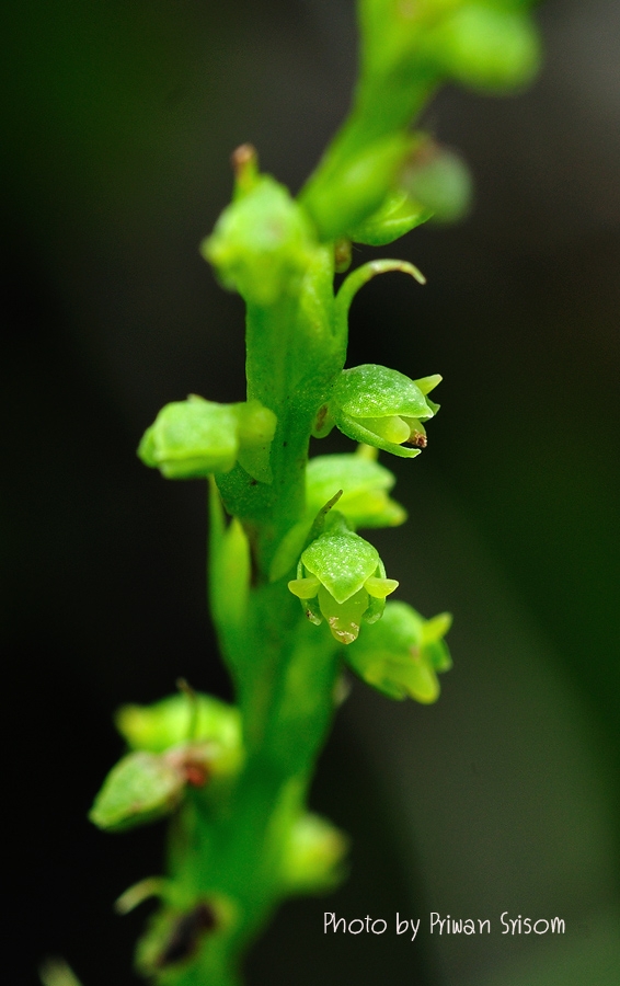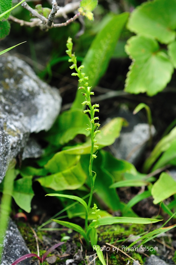 Found in Chang Mai Thailand in grasslands and exposed limestone crevasses at elevations around 1500 to 2000 meters as a miniature sized, cool growing terrestrial with 2 to 3, cauline, scattered along the stem, lanceolate-linear, acute, mucronate leaves grading into none to 3, erect, linear-lanceolate, acuminate sterile bracts leaves that blooms in the late summer and early fall on an erect, glabrous, 3 to 6.4” [7.5 to 16 cm] long, semi-dense to lax, 8 to 20 flowered inflorescence with a 1.2 to 1.8” [3 to 4.5 cm] long, rachis carrying narrowly lanceolate-elliptic to lanceolate, acuminate to acute floral bracts.
