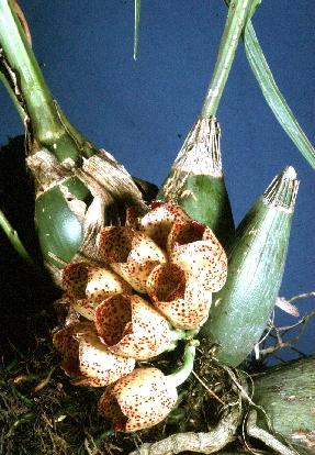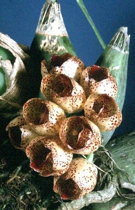 Found in Colombia, Venezuela, Guyana, Surinam, Brazil and Peru in tropical wet forests as a medium to large sized, hot growing, caespitose epiphyte at elevations around 400 meters with an ovoid, smooth, trifoliate pseudobulb subtended by several pairs of basal sheaths soon evanescent with a coriaceous, dark green, plicate, articulated leaf with a channeled petiole that blooms in the late winter and early spring on an arching, basal, 2 to 3 1/2" [5 to 8 cm] long, racemose inflorescence arising as a new growth appears with acuminate bracts carrying globose, fleshy flowers that only partialy open.