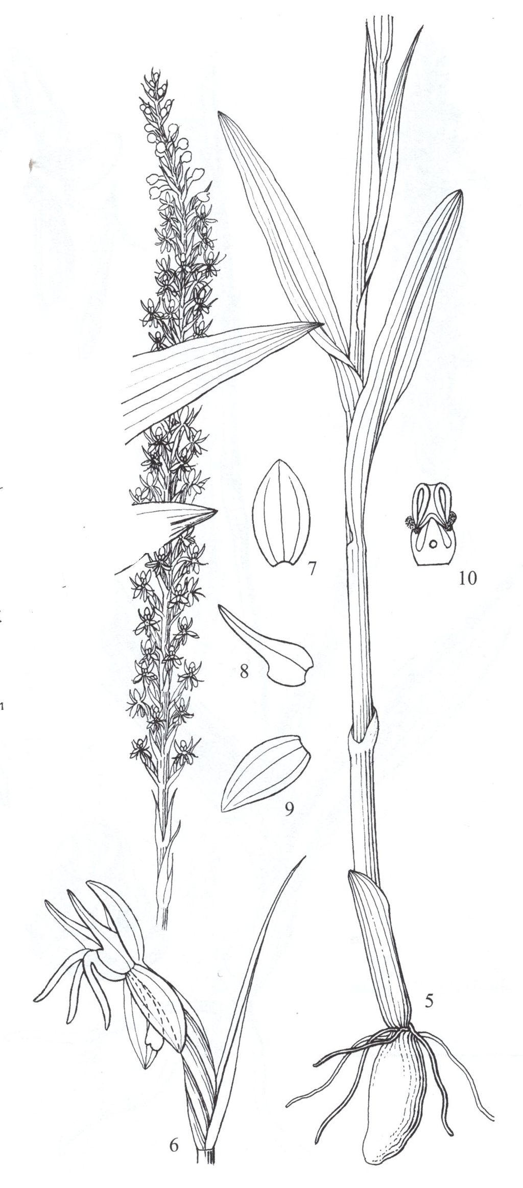 Found in western Sichuan and northwestern Yunnan provinces of China in fir forests, thickets and and alpine grasslands at elevations of 1700 to 3900 meters as a small to medium sized, cool to cold growing terrestrial with oblong tubers giving rise to an erect stem provided with 2, basal tubular sheaths and carrying 4 to 5, widely spaced along the stem, oblong-lanceolate, acuminate to acute leaves that blooms in the summer and late fall on a terminal, erect, peduncle 2.4 to 4.4" [6 to 11 cm] long, cylindric, slender, provided with 4 to 8 lanceolate, sterile bracts, rachis 2 to 8.4" [5 to 21 cm] long, 4.4 to 13.2" [11 to 33 cm] long overall, subdensely many flowered inflorescence with acuminate, lower ones exceeding the flowers floral bracts.