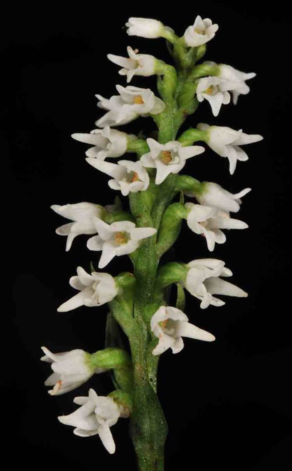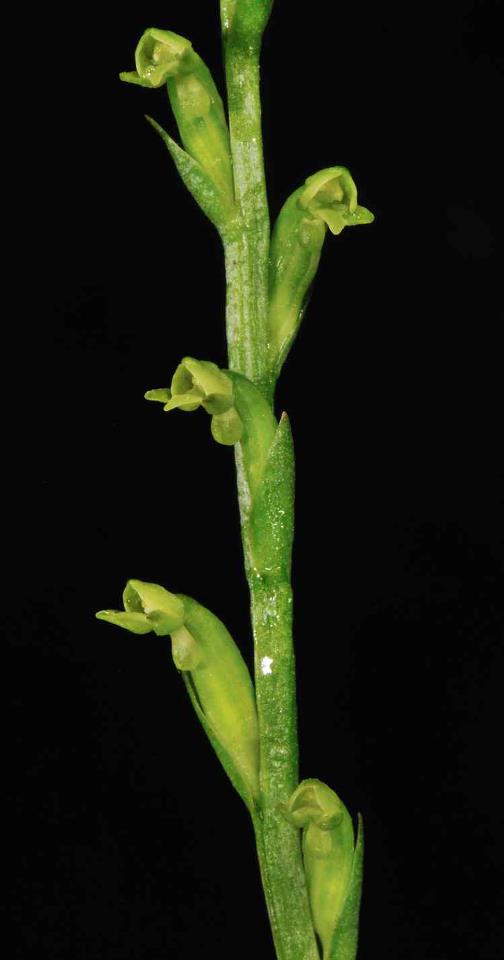 Found in the Chinese Himalayas, eastern Himalayas, Nepal, Myanmar and Thailand on moist alpine slopes and in rhododendron forests in shade at elevations around 2700 to 3660 meters as a miniature to small sized, cold growing terrestrial with a cylindric-fusiform, pubescent tuber giving rise to an erect, slender stem with subbasal, bracteate leaves becoming ebracteate above and linear-lanceolate, acute stem bracts and carrying a single, oblong to oblong-elliptic, subacute, sessile leaf that blooms in the late spring and summer on a glabrous, 1.4 to 3.6" [3.5 to 9 cm] long, laxly 7 to 12 flowered inflorescence with lanceolate, subacute to obtuse floral bracts.