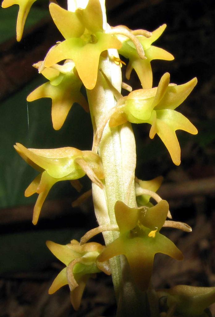 Found in the Chinese Himalayas, Assam, eastern Himalayas, India, Andaman Islands, Myanmar, Thailand and Vietnam in tropical valleys, broad leaved forests and thickets at elevations of 610 to 1800 meters as a medium to large sized, warm to cool growing terrestrial with an ellipsoid, pubescent tuber giving rise to a leafy around the middle, bracteate above stems with linear-lanceolate, long acuminate, sheaths and carrying 4 to 5, ovate-elliptic, acute, narrowing below into the short, channeled petiolate base leaves grading above into 2 to 8, spreading to suberect, lanceolate, acuminate, sterile bracts that blooms in the late spring and early summer on a glabrous, 2 to 7.6" [5 to 19 cm] long, subdensely to laxly many flowered inflorescence with lanceolate, acuminate floral bracts.