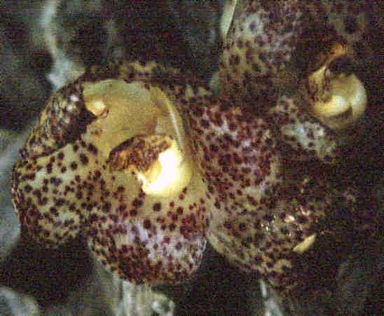 Found in Guyana as a medium sized, hot to warm growing epiphtye with ovoid-oblong, strongly compressed, 3 to 4 sulcate lined, rugose pseudobulbs enveloped basally by a few small, membraneous, dark green sheaths and carrying 3 to 4, apical, plicate, 5 to 7 nerved, lanceolate to oblong-lanceolate, acute, attenuate below into the elongate petiolate base leaves that blooms on a robust, pendant, basal, 2.4 to 6" [6 to 15 cm] long, 8 to 12 flowered inflorescence.