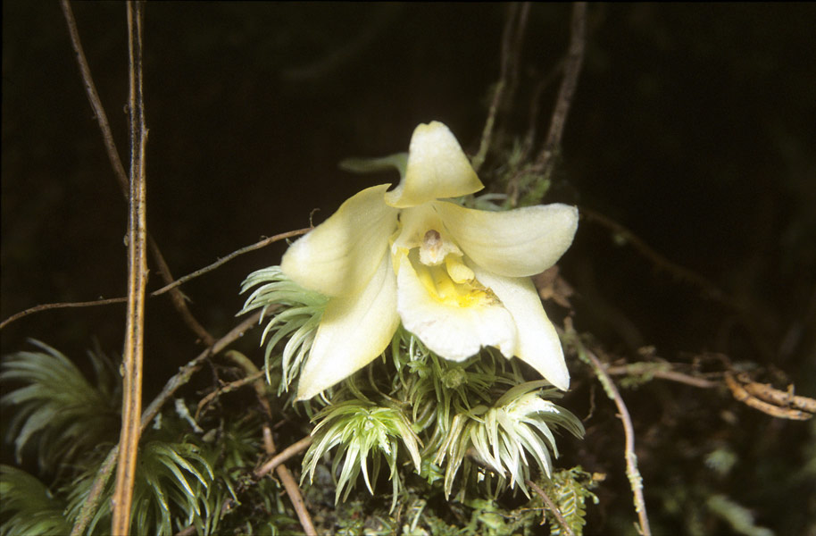 Found in Java and Sumatra at elevations of 760 to 1900 meters as a large sized, warm to cool growing terrestrial with close set, basally thickened, more or less terete but somewhat angular stems carrying 5 to 10, elliptic to oblong-elliptic, acute, long acuminate, 7 prominent nerved beneath, channeled petiolate base leaves that blooms on an erect, from the nodes of the stem, the peduncle 1.6" [4 cm] long, the angled rachis to 1.48 to 2" [3.7 to 5 cm] long, laxly to 9 flowered inflorescence.