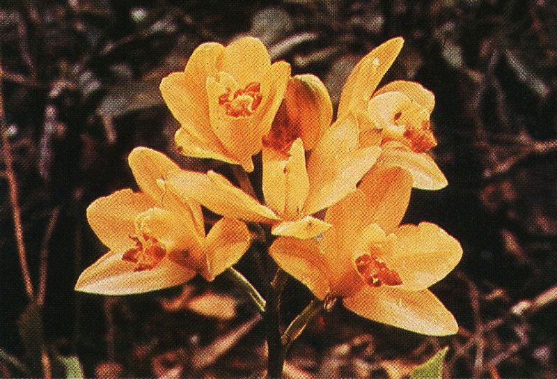Found in central and southeast New Caledonia on rotting logs with 2 forms that grow in 2 different elevational locations the first one at 100 to 600 meters with green leaves with varying amounts of yellow specks with 6 to 15 pale yellow flowers with a dull orange midlobe and the second form is at 800 to 1200 meters and has pale green leaves and 3 to 11 golden yellow flowers with an oranger red midlobe of the lip. The first form is a hot to warm growing terrestrial the second form is a warm to cool growing terrestrial or epiphyte that blooms in the spring, early summer and fall.