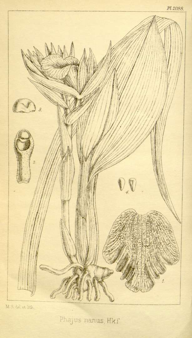 References W3 Tropicos, Kew Monocot list , IPNI ; Icones 21 Hooker 1892 drawing fide; The Orchids of Sikkim-Himalaya Part 1 King & Pantling 1898 as Phajus nanus drawing ok; Indian Orchids, Guide to Identification and Culture Pradhan 1979; Die Orchideen 3 Auflage Bd 1 Sonderabdruck aus Schlechter Lieferung 15 881 - 944 Brieger, Maatsch and Senghas 1984; The Orchids of Bhutan Pearce & Cribb 2002; AOS Bulletin Vol 84 #8 2015 photo fide;