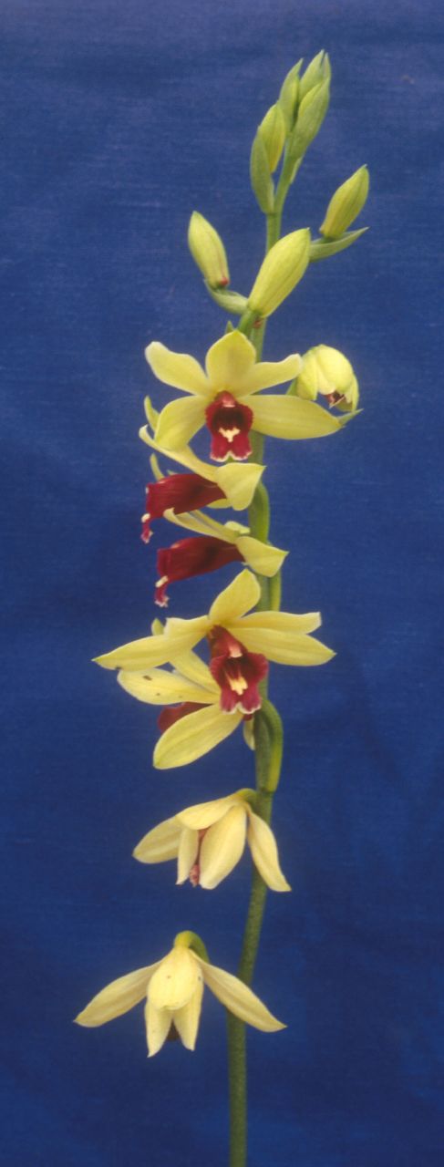 Found in Madagascar, Mauritius and Reunion Island in damp, evergreen forests at elevations of 700 to 1800 meters as a medium to large sized, warm to cool growing terrestrial or epiphyte with 2 to 3, the oldest green & discoid, the newest enveloped by sheaths, cauliform pseudobulbs carrying 3 to 4, narrowly lanceolate, acute, plicate, undulate margined, longly acuminate at both ends, petiolate base leaves that blooms in the late spring and summer on an erect, longer than the leaves, 16 to 32" [40 to 80 cm] long, peduncle enveloped by 3 to 4 basal sheaths and several sterile bracts becoming caducous above, rachis 4 to 8" [10 to 20 cm] long, loose, 12 to 15 flowered inflorescence with very caducous, lanceolate, very acute, as long as to a bit longer than the pedicel and carrying very large, variable colored flowers.