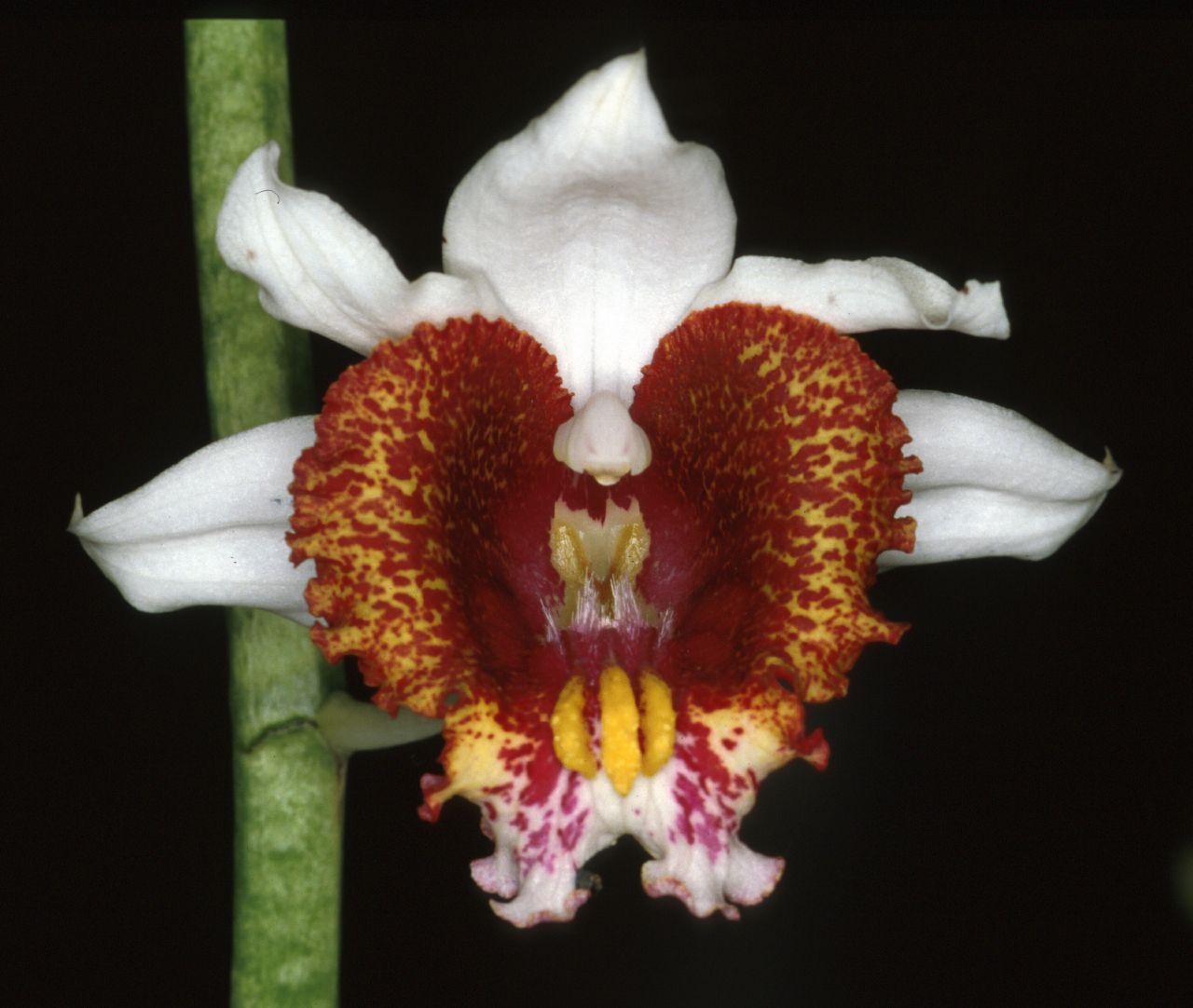 A large Madagascan cool to hot growing terrestrial species at elevations of 200 to 900 meters that blooms in the fall on a erect, stout, to 2' [60 cm] long, few to several flowered, apical inflorescence with successive opening, long-lasting flowers occuring over a long period and has a white bract at each joint.