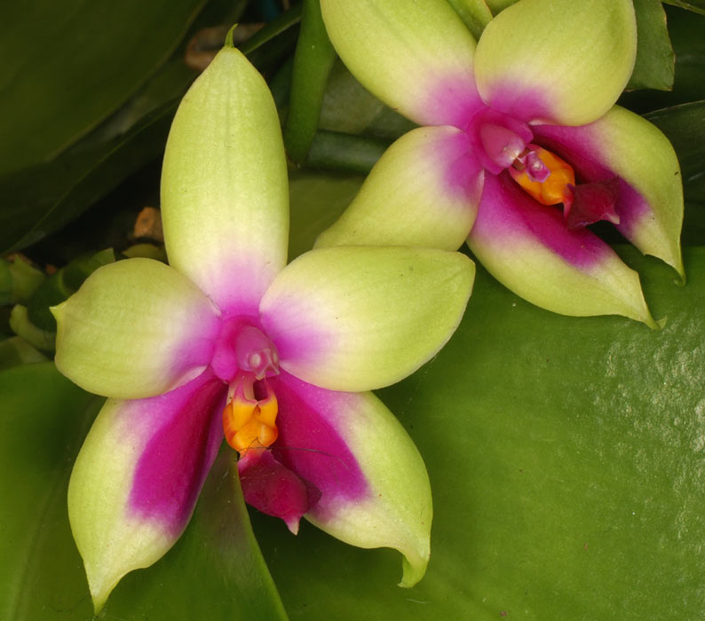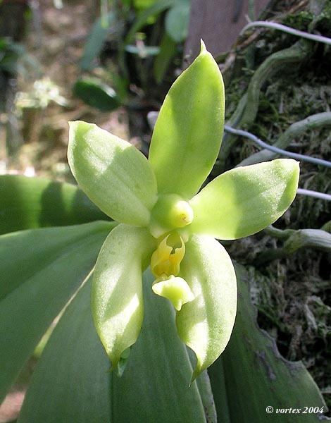 This species is a small sized, hot growing, pendant growing epiphyte from Borneo in shady, humid, lowland and swampy riverine forests low down on trees often near or on branches overhanging stream banks at elevations of sealevel to 200 meters with an erect to ascending, short stem completely enveloped by persistant leaf-bearing sheaths and carrying pendulous, broad, rounded, light green leaves that blooms in the summer and fall on a suberect or arcuate, 2 3/4" [7 cm] long, racemose or paniculate, few flowered inflorescence with a flattened, fractiflex rachis and small ovate bracts and has only 2 to 3, highly fragrant citrus scented flowers open at a time. The inflorescence on older plants can rebloom year after year so do not cut off green viable inflorescence.
