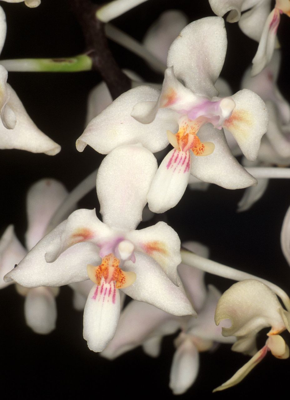 Found in Sulawesi, at elevations of 400 to 600 meters as a miniature sized hot to warm growing epiphyte with dark green, mottled with silver grey leaves that blooms in July and August on a lateral, arching then pendant, 16 to 24" [40 to 60 cm] long, purplish-green, racemose or paniculate, many flowered inflorescence with small bracts and successively opening flowers, starting at the base of the inflorescence