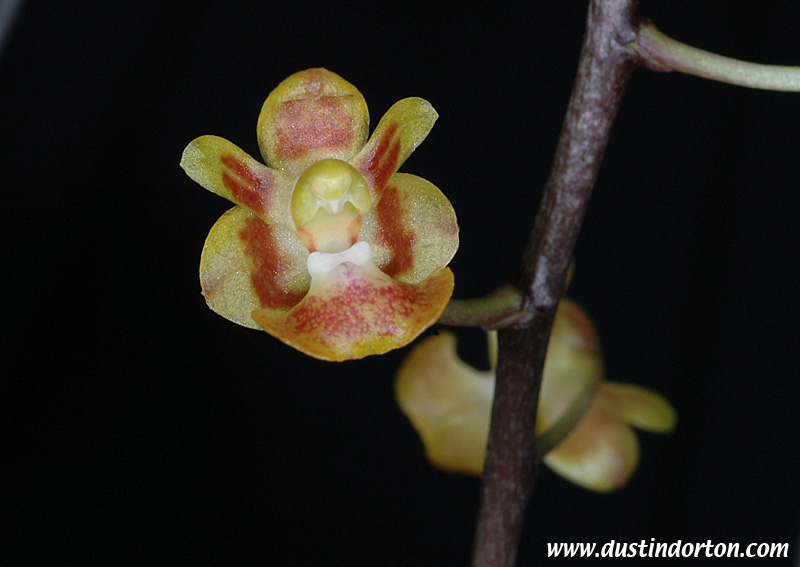 Found in Vietnam in tropical moist forests at elevations of 400 to 600 meters as a small sized, hot to warm growing epiphyte with elliptic to obovate, obliquely emarginate, lightly suffused with purple leaves that blooms in the spring on an erect, racemose, dull purple, to 4" [11 cm] long, several flowered inflorescence with to 13 simultaneoulsy opening flowers.