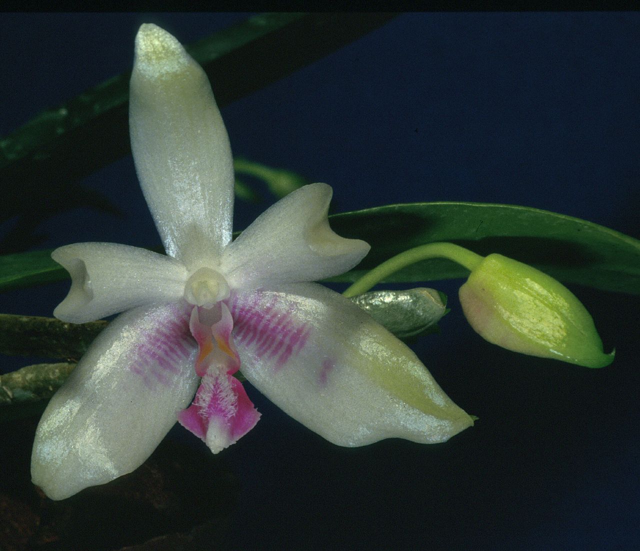 Found on the Islands of Java, Sumatra and Sarawak in hill forests on limestone cliffs in moss and on trees in dappled sun at elevations of 790 to 1300 meters as a medium sized, warm to cool growing epiphyte with a short stem enveloped by persistent, imbricating leaf sheaths carrying suberect, oblong-elliptic to elliptic obovate, acute or obtuse leaves that blooms in the spring on a recurved, 11" [27 cm] long, racemose or paniculate, laxly many flowered inflorescence with small ovate-triangular bracts and has simultaneous opening, fleshy flowers.