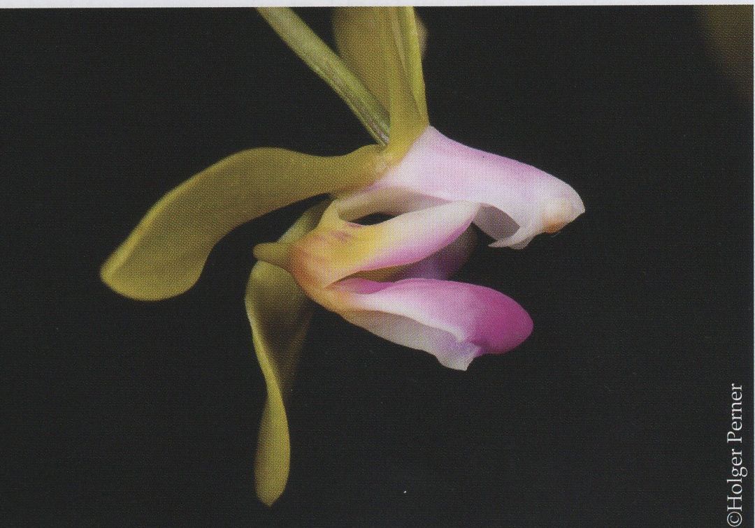 Found in Yunnan province of China at elevations of 2000 meters as a miniature sized, cool to cold growing epiphyte with warty roots giving rise to a stem carrying 1 to 2, obliquely elliptic, acute, persistent sheathing base leaves that blooms in the spring on a racemose, 3" [7.7cm] long, simple, few [3 to 6] flowered inflorescence with ovate floral bracts and carrying strongly fragrant flowers