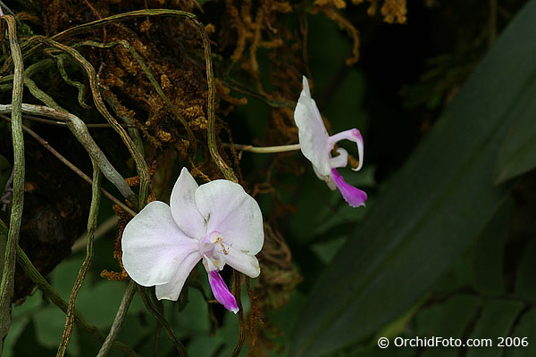 Found in Myanmar, Thailand and Borneo in conjunction with limestone rocks at elevations around sealevel to 500 meters near rivers as a miniature sized, hot to to warm growing epiphyte or sometimes lithophyte with deciduous leaves with an erect or ascending stem enveloped by imbricating leaf bases carrying elliptic, obovate or oblong-elliptic, fleshy, acute or obtuse leaves that blooms in the summer and earlyfall on a lateral, arcuate to pendant, 10 to 15" [25 to 37.5 cm] long, racemose or rarely paniculate, laxly many flowered inflorescence with small triangular bracts and fragrant, fleshy, long-lived flowers that have an extremely long, beak-like rostellum.